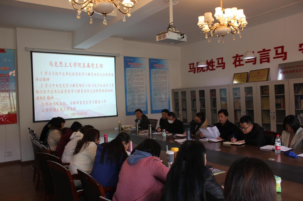 3月3日,马克思主义学院直属党支部召开全院大会,专题学习习近平总书记在党史学习教育动员大会上的重要讲话精神,传达学习中央党史学习教育领导小组《关于认真学习贯彻习近平总书记在党史学习教育动员大会上的重要讲话的通知》和省委教育工委《关于进一步开展好“网上重走长征路”暨推动“四史”学习教育的通知》精神,并结合实际对马院开展党史学习教育工作进行安排部署。马克思主义学院直属党支部书记、院长曹武军主持会议。