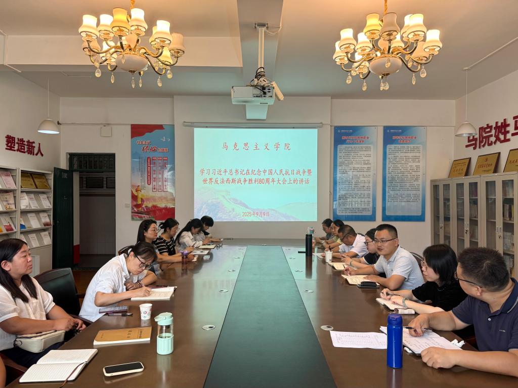 9月9日,马克思主义学院召开学习贯彻习近平总书记在纪念中国人民抗日战争暨世界反法西斯战争胜利80周年大会上重要讲话精神的会议。马克思主义学院全体教师参加,会议由党总支书记、院长蹇勇主持。