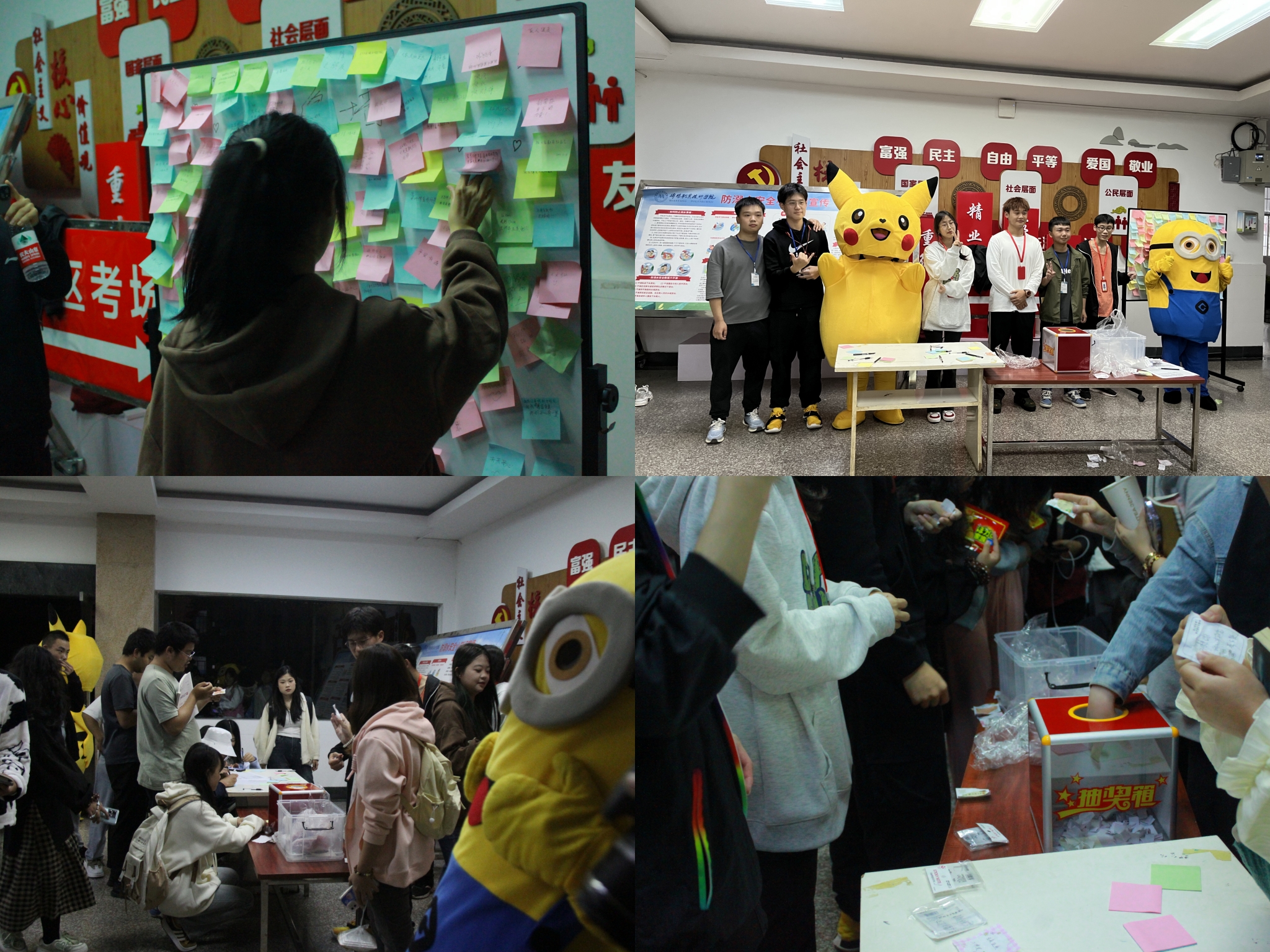 10月17日晚,材料与建造学院心理部在第一教学楼B区大厅开展“祈愿墙活动”。活动邀请同学们在便利贴上写下对自己未来的期望、自己喜欢的一句话或一句歌词贴上祈愿墙,表达同学们的美好祝愿以及对大学学习生活的目标,以此来认识自我、关爱自我和发展自我。活动现场气氛热烈,同学们积极热情参与,并获得玩偶拥抱和抽奖礼品,有效促进了同学们做好大学学习生活规划,更好适应大学生活。